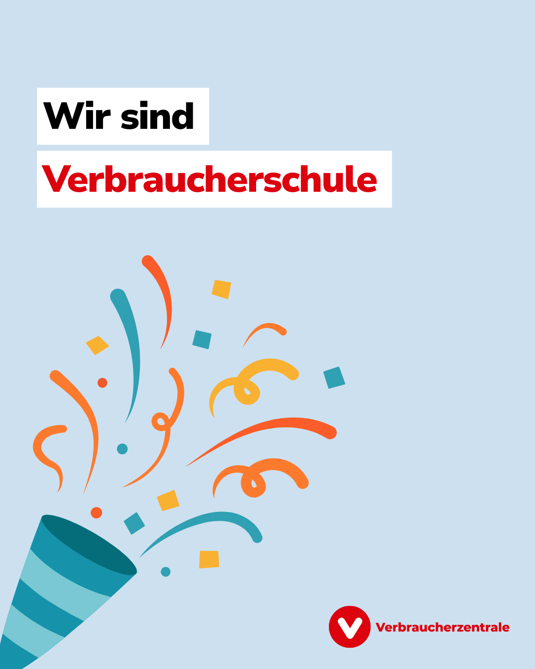 Auf dem Bild ist eine Konfettikanone zu sehen und der Satz Wir sind Verbraucherschule